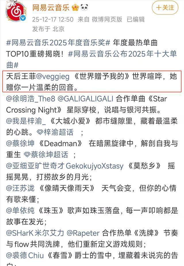 没想到就这么一首歌,在25年要结束的时候,某音乐平台官方账号发文了。 12月17日,大家才知道,这一年的年度热曲王菲的歌曲《世界赠予我的》已经跃到榜上前十了,而菲姐实在太厉害了,这首歌直接是榜一。